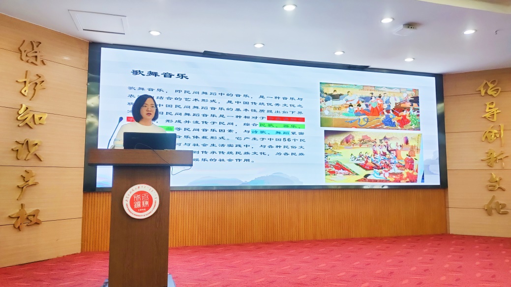 首先,胡佳老师向同学们介绍了中国传统歌舞音乐,歌舞音乐体裁主要分为歌舞、乐舞和歌舞小戏三种形式。“歌舞”一般是指歌唱和舞蹈为主的表演形式,例如蒙古族《安代舞》,汉族的秧歌、采茶,花鼓等形式。“乐舞”指的是器乐和舞蹈因素为主的舞蹈表演形式,例如陕北腰鼓、维吾尔族手鼓舞、朝鲜族长鼓舞等。民歌进入舞蹈音乐之后,开始向带有传说、故事的表演过渡,孕育出了说唱形式,更多地形成了“小戏”,不仅是地方小戏,我国的传统大戏如昆曲、京剧等,也吸收了民间歌舞中的精华,从而形成了独特的歌舞剧形式。
