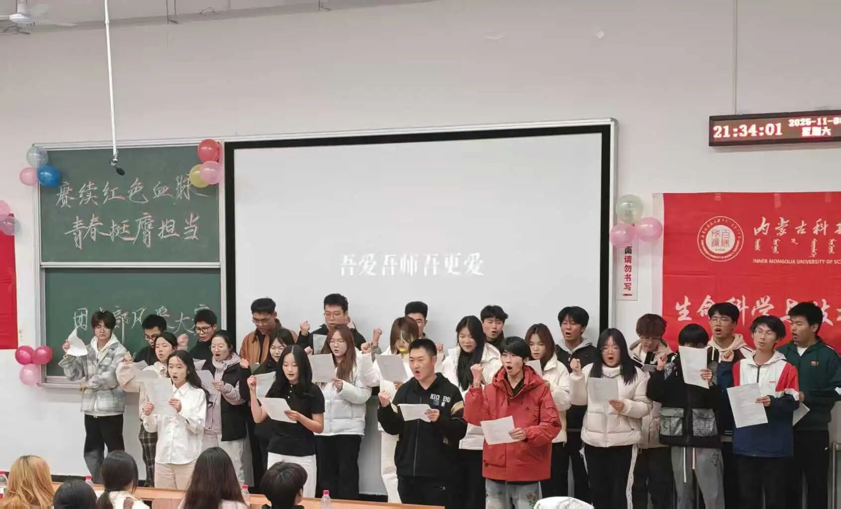 25生技1班的合唱《我们的明天》,以清澈旋律铺陈青春梦想,渐次汇聚为饱满和声,传递出对未来的坚定信念;25食品1班的朗诵《青春为炬,青春向党建行》,表演者仪态挺拔、声情并茂,从“少年强则国强”的经典宣言到“以青春之我,建青春之国”的时代强音,句句彰显青年学子的赤子之心与报国之志;25农生职班演唱的《团结就是力量》,以激昂歌声展现团结奋进的青春力量;25生信2班的舞台剧《五四运动》,生动再现百年前青年学子的爱国壮举,引领观众穿越时空,感受五四精神的时代回响。