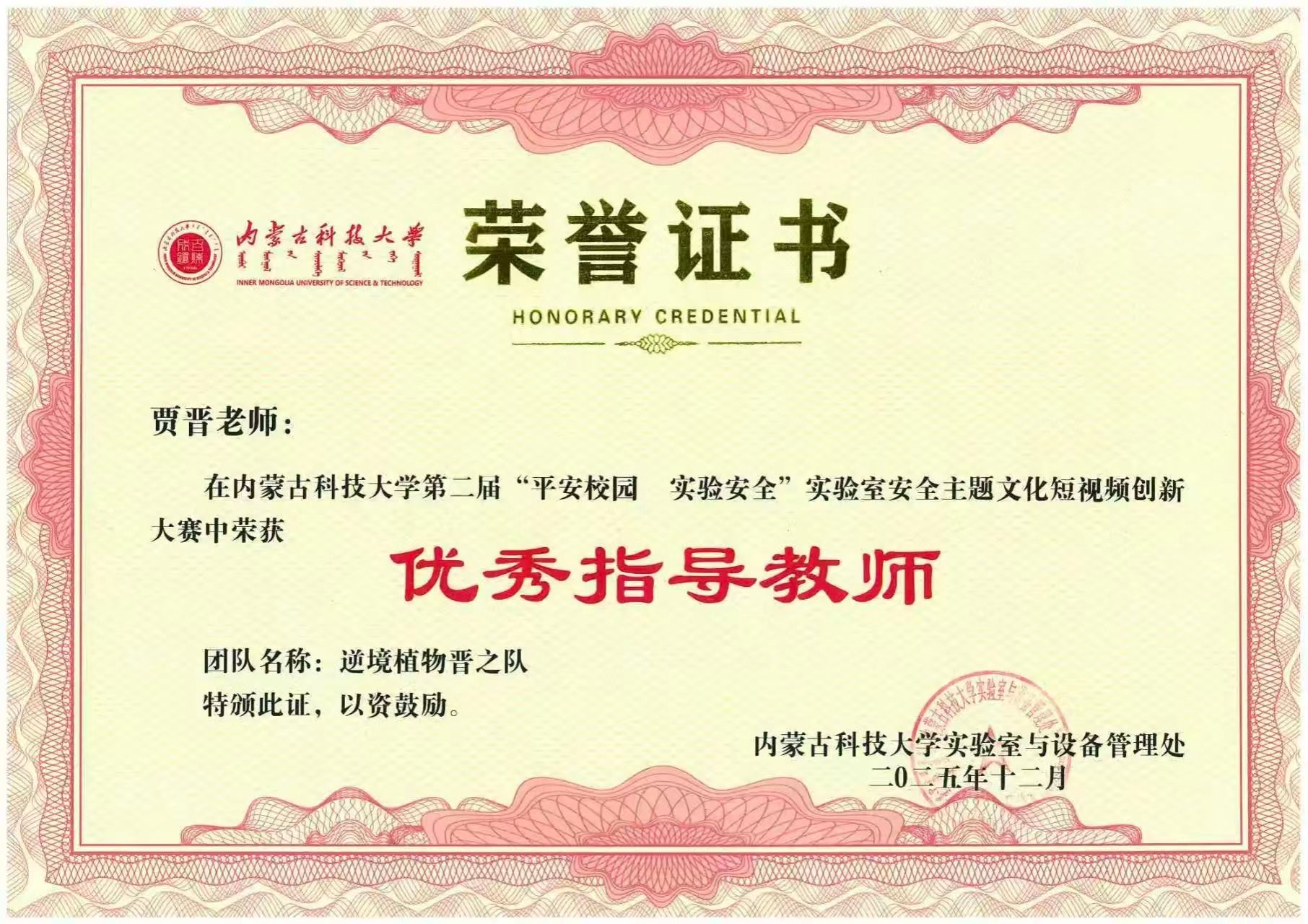 在beat365唯一官方网站第二届"平安校园 实验安全"实验室安全主题文化短视频创新大赛中,由贾晋、乌日根老师指导的"逆境植物晋之队"(学生成员:王虹媛、张韵晗、王思璎、李紫艳、梅丽、王智莹、王凤硕)再创佳绩,凭借创意新颖、内容充实的作品荣获一等奖,同时两位指导教师荣获"优秀指导教师"称号。