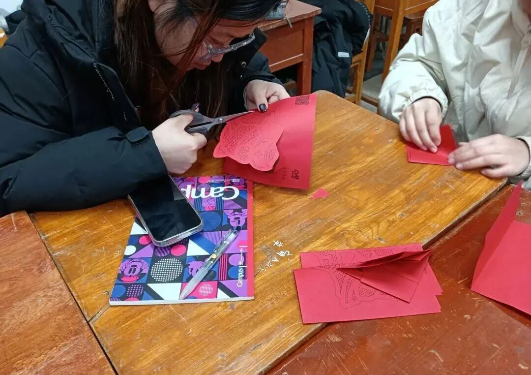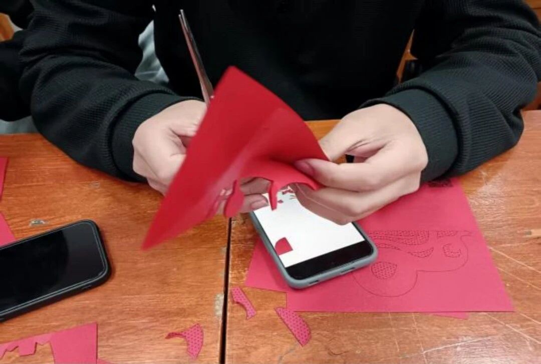 在“红色新春”主题创作环节,党员们选取特色模板,细心裁剪。过程中大家积极交流技法、互帮互助,现场氛围温馨热烈。剪刀与红纸的沙沙声、轻声的讨论与舒缓的背景音乐交织,传递出浓浓的迎新暖意与协作情谊。